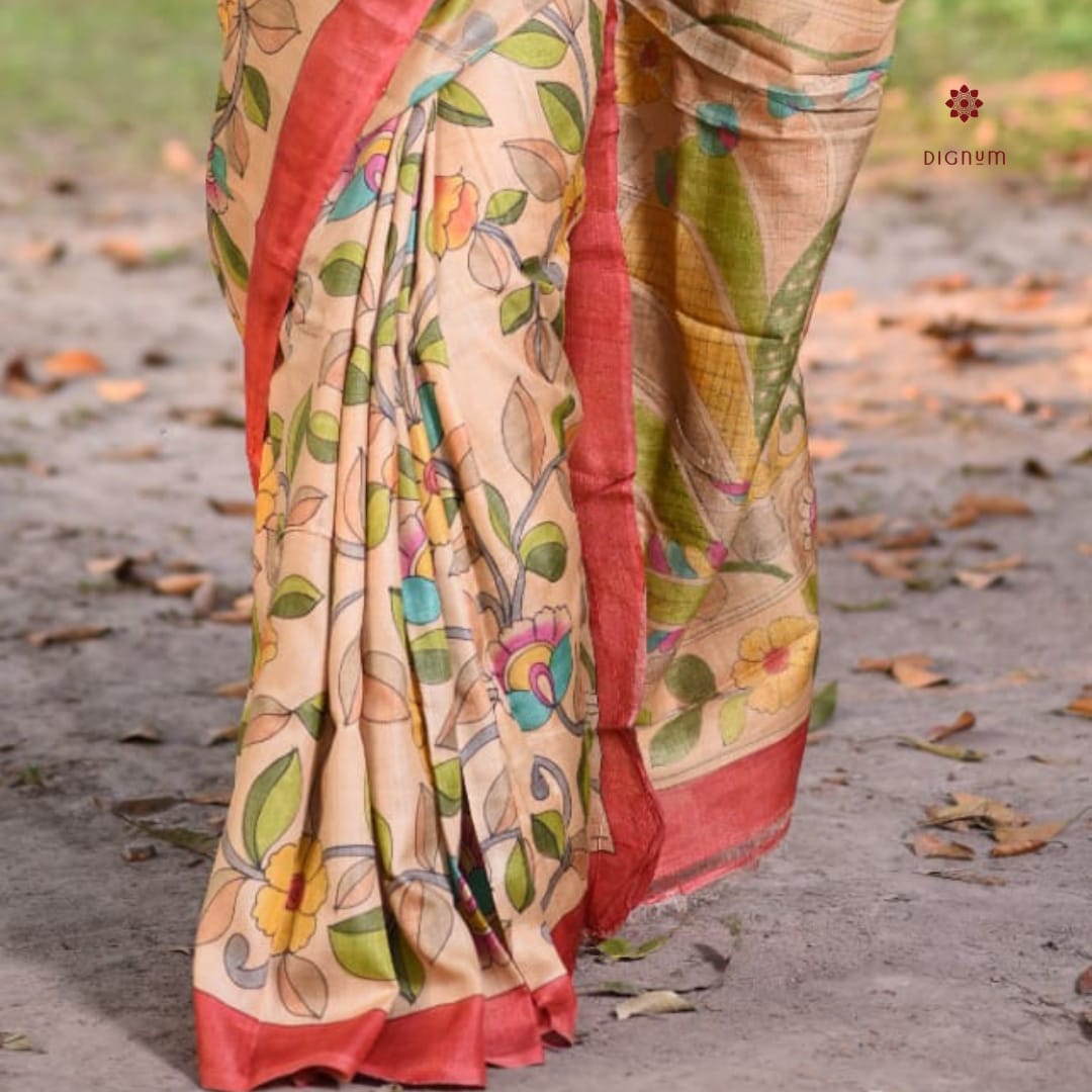 Beige Hand Painted Kalamkari Pure Silk Saree