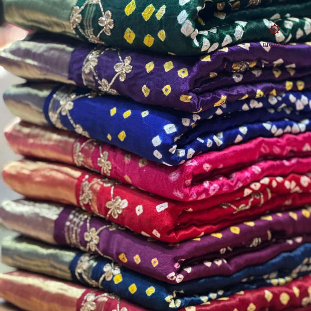 Saree Fabric: Exquisite Gaji Silk Original Bandhani Saree, featuring intricate Ek Dani Bandhani design and traditional Gota Patti handwork. Crafted from pure modal Gaji silk, it showcases an authentic Lagdi Patta pallu adorned with meticulous handwork. The saree is a testament to skilled craftsmanship, with all-over hand-done Bandhej patterns.