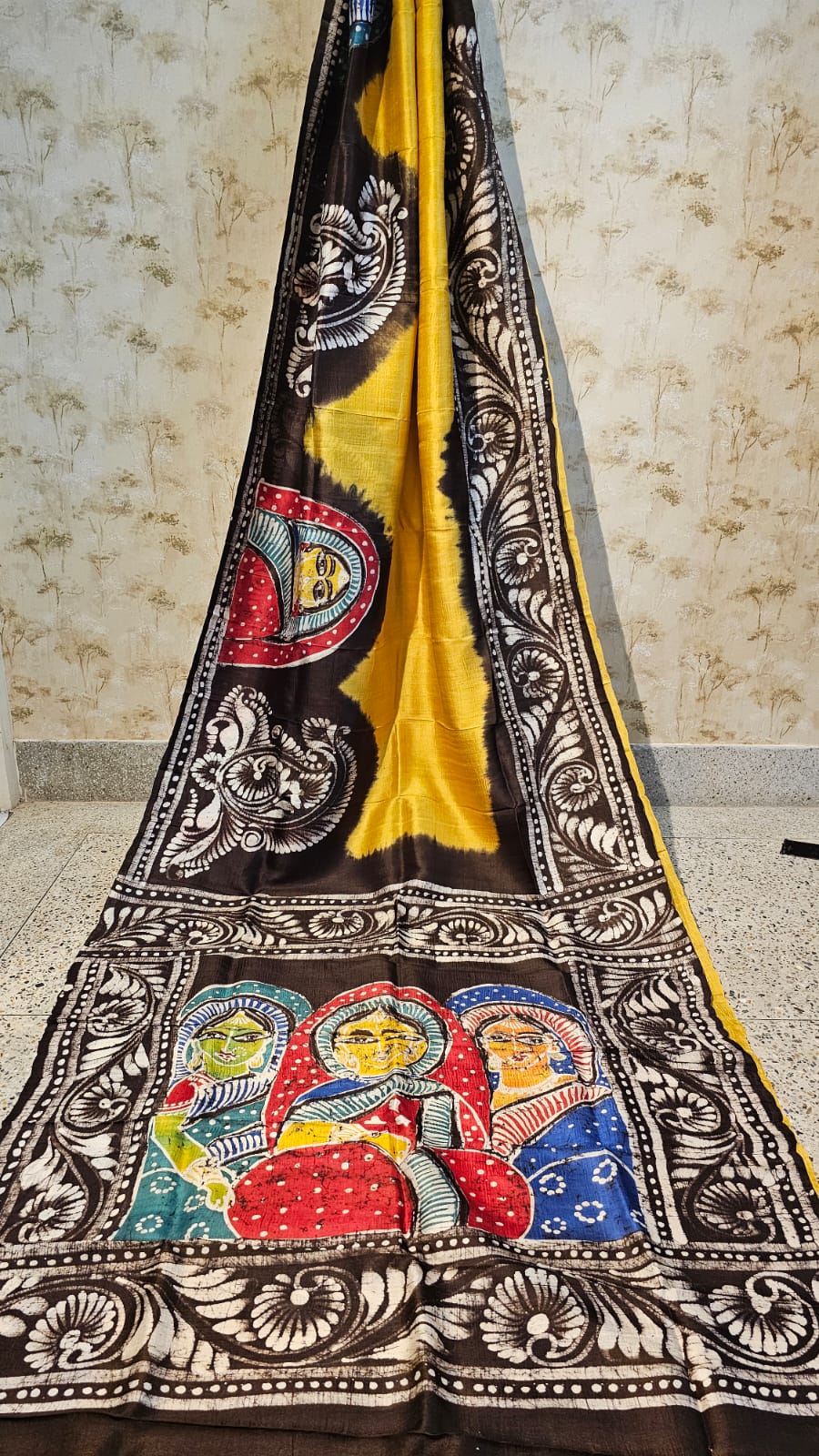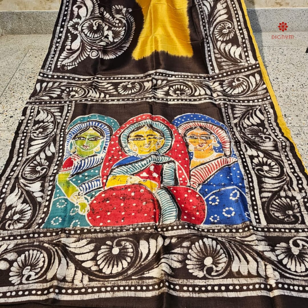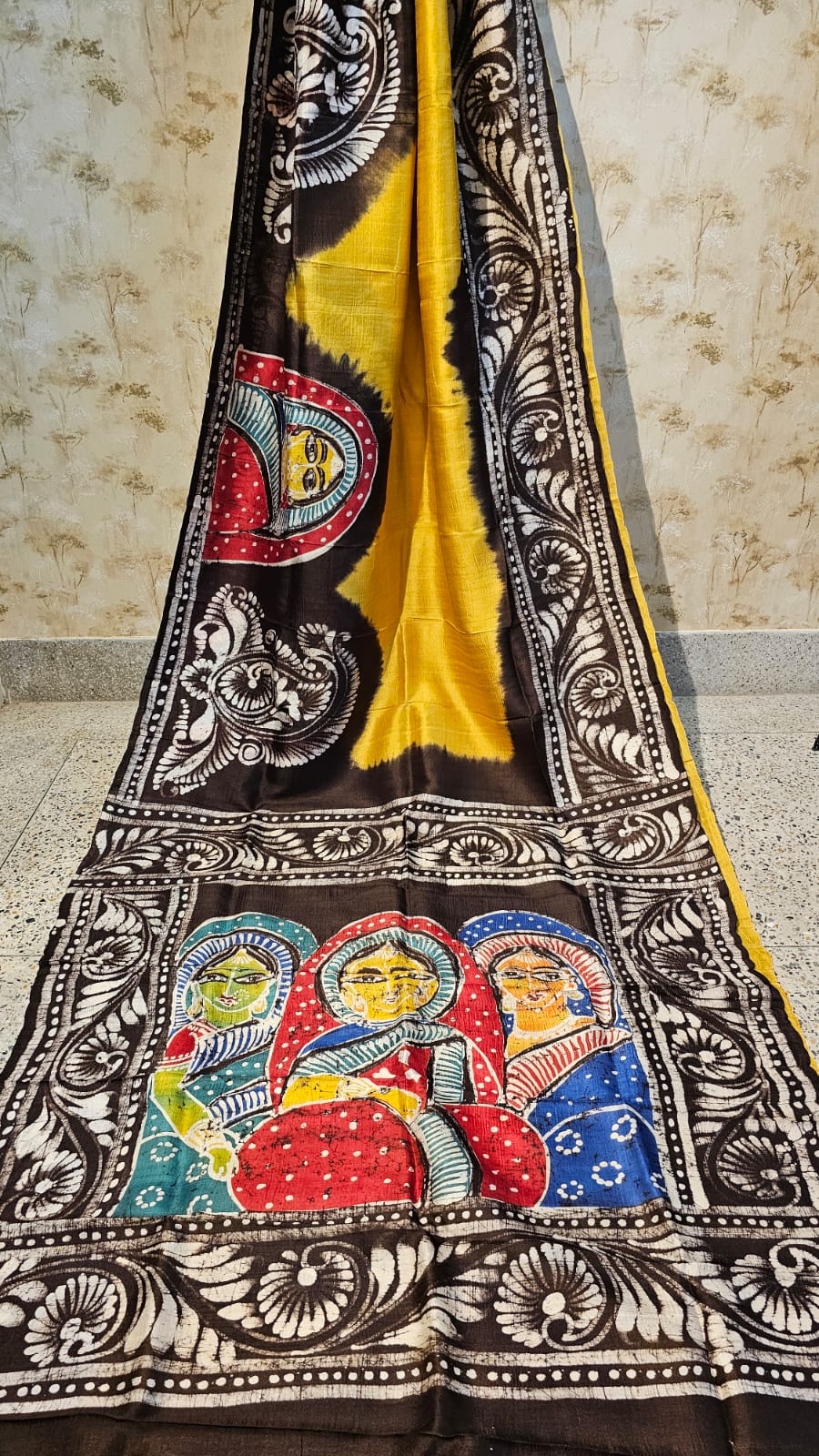 Saree Fabric: Premium Quality Handmade Wax Batik Painted Bishunpuri Silk 3 Ply Saree with Beautiful Pallu.