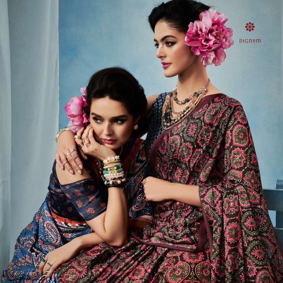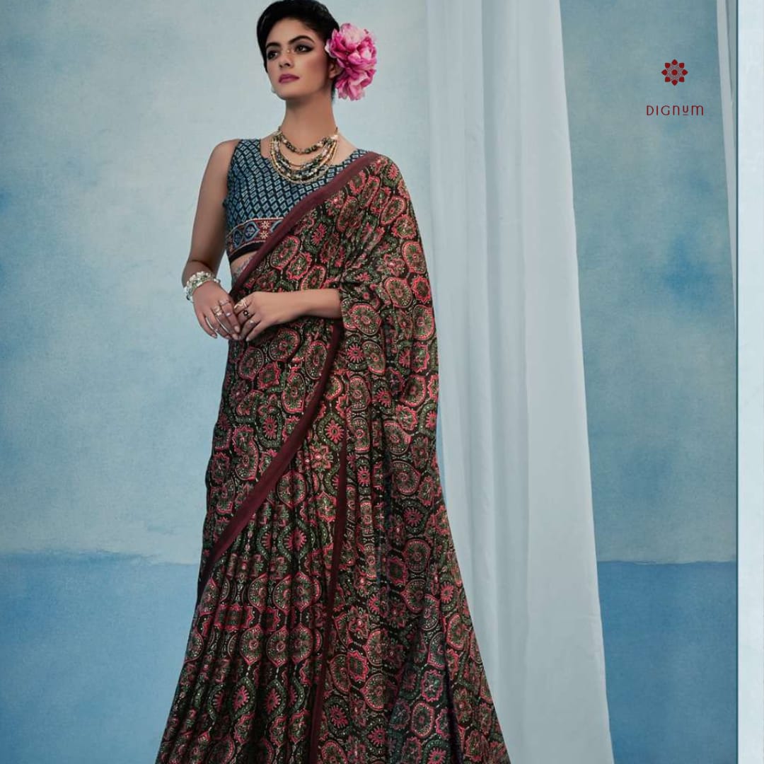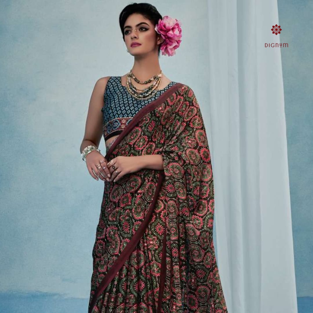 Be the first to review “Brown Stylish Ajrakh Printed Satin Saree”