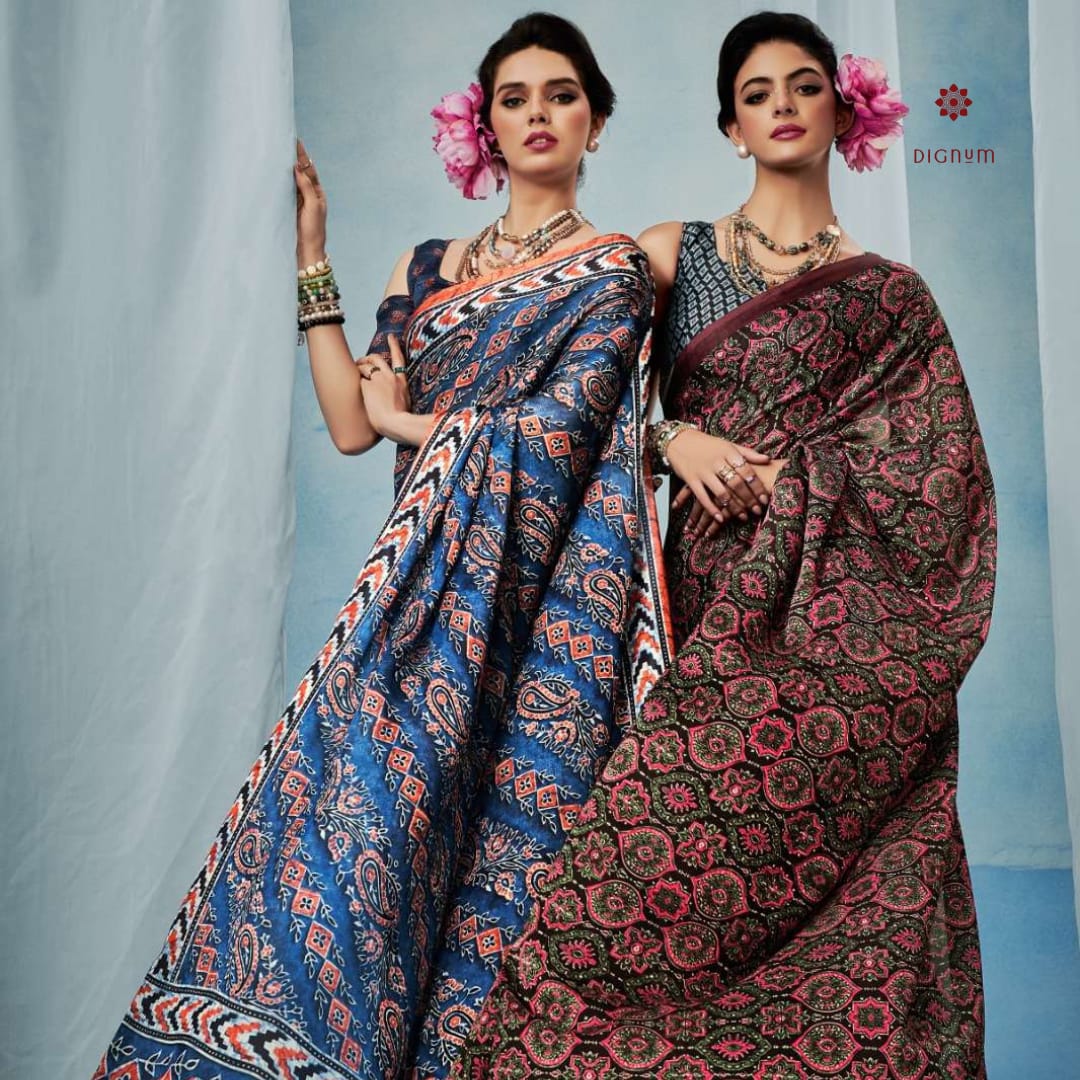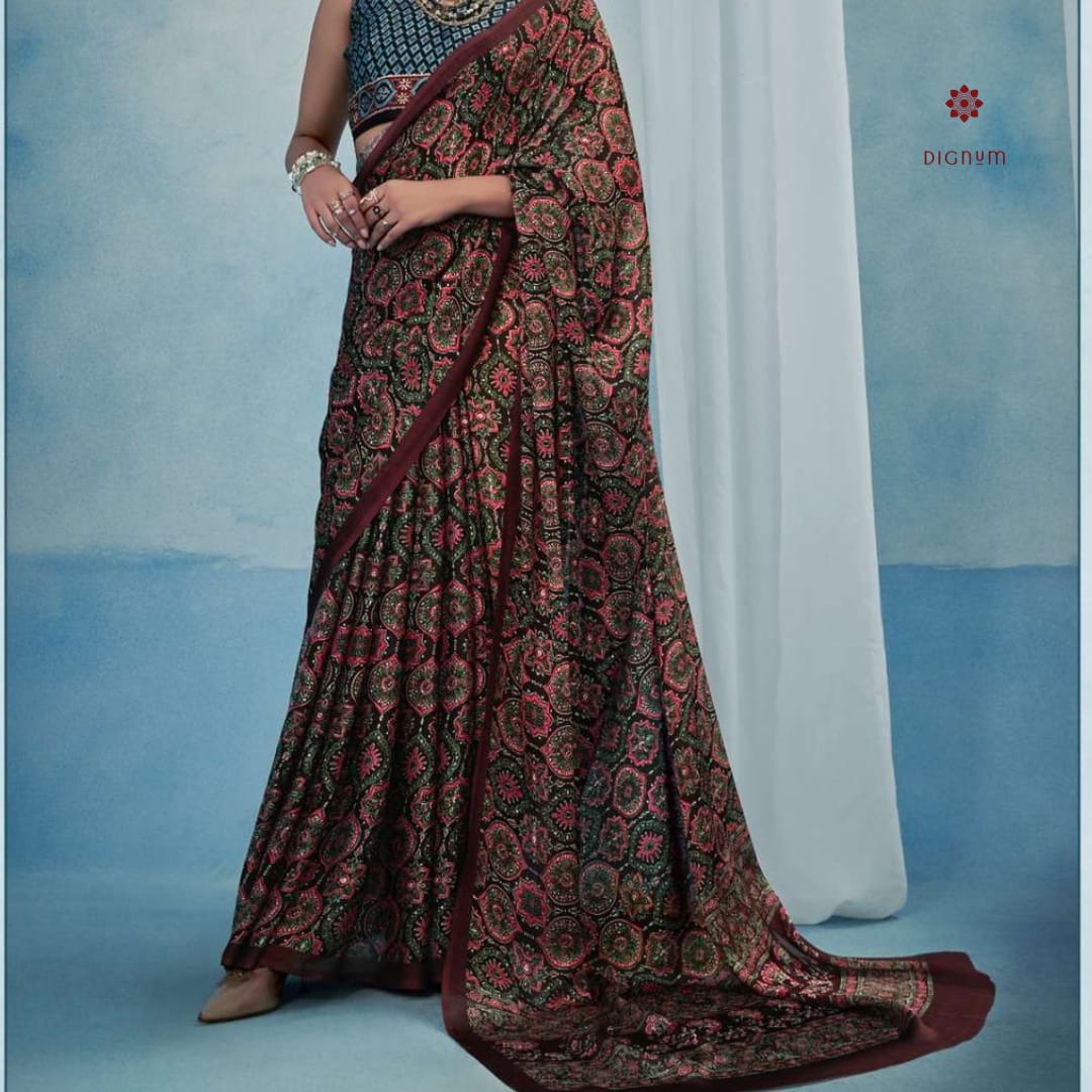 Saree Fabric: Elevate your ethnic wardrobe with this Stylish Ajrakh Printed Satin Saree, featuring intricate traditional prints on smooth satin georgette fabric. The saree boasts a rich, glossy finish that drapes beautifully, perfect for festive and formal occasions. Paired with a stylish satin georgette blouse, it blends timeless craftsmanship with modern elegance.