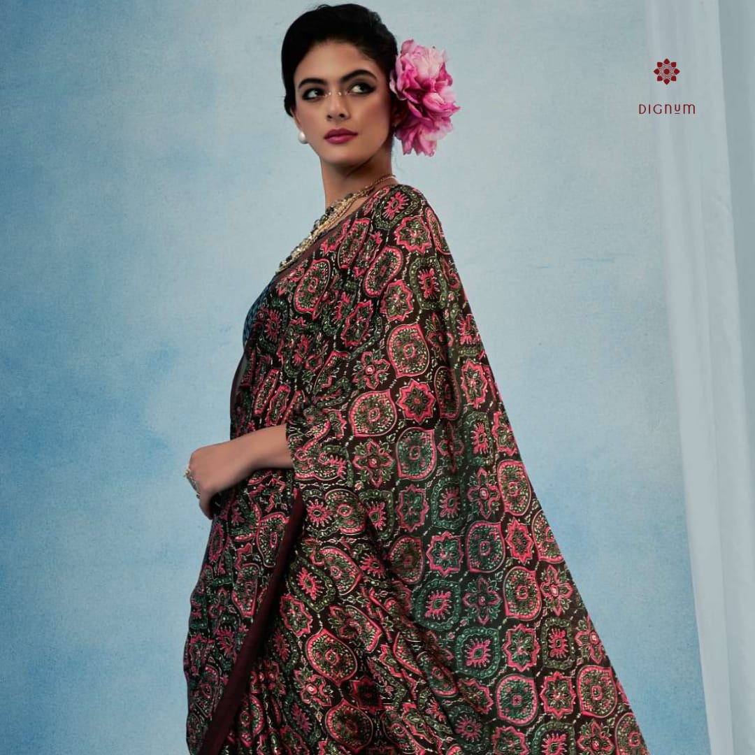 Brown Stylish Ajrakh Printed Satin Saree