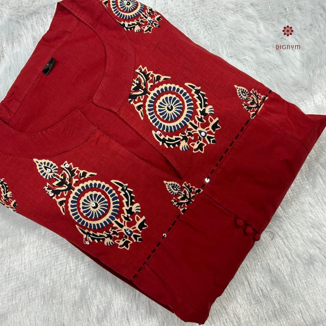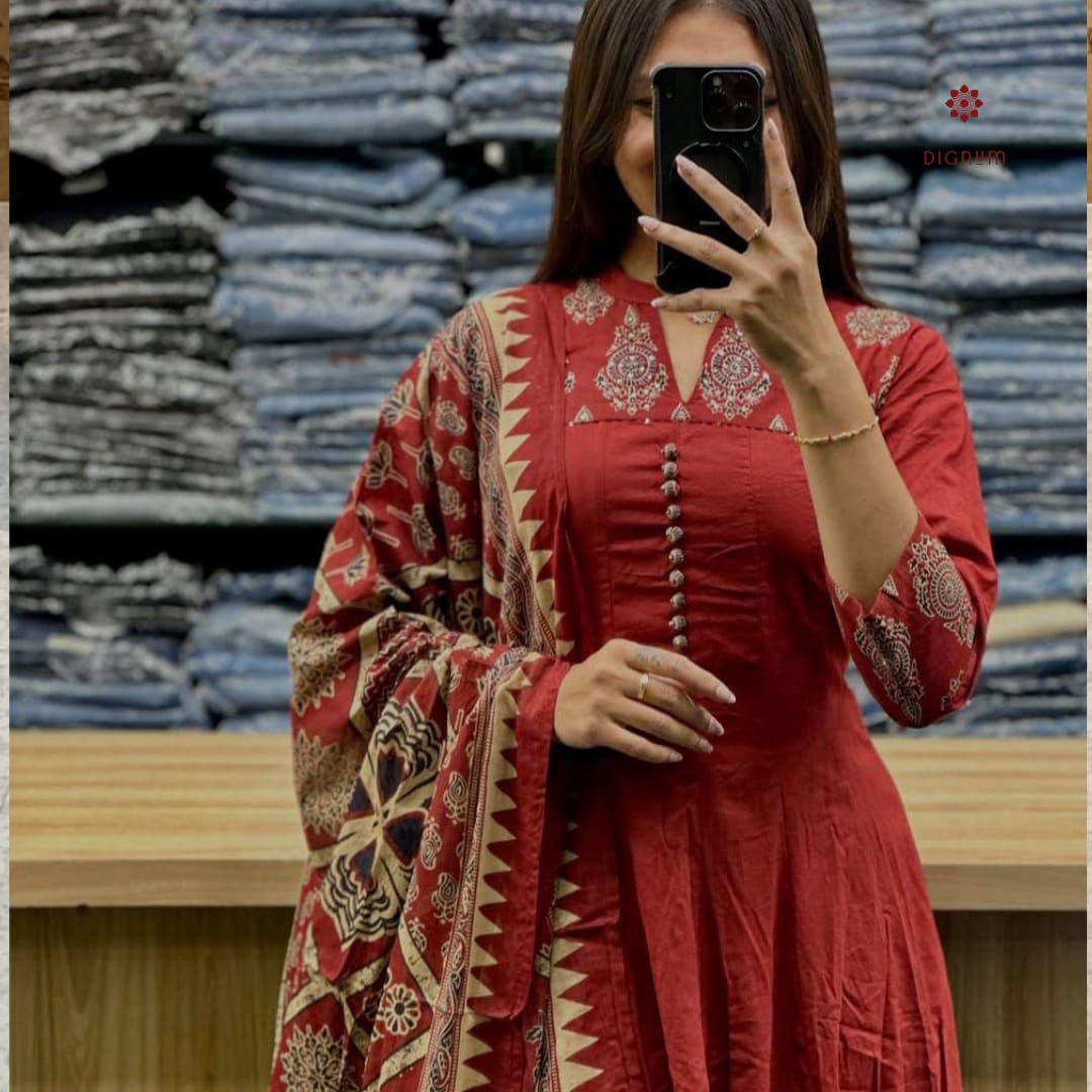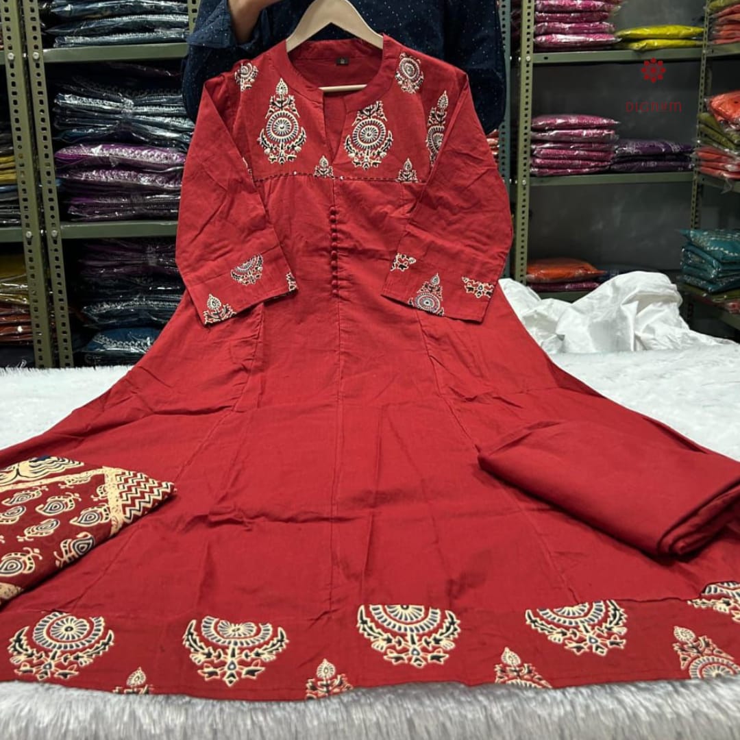 Be the first to review “Burnt Red Printed Anarkali Katha Work Suit Set”