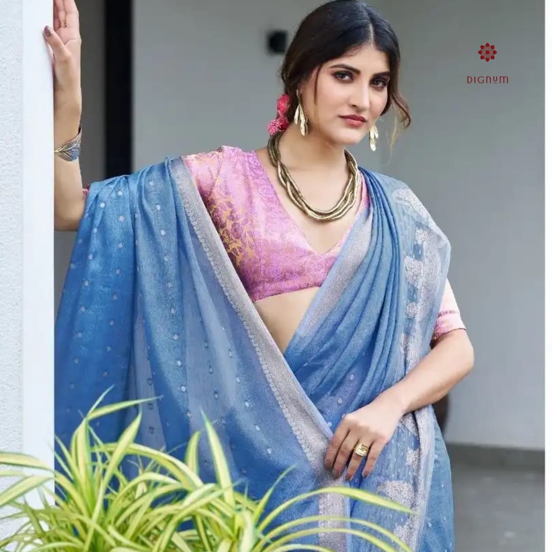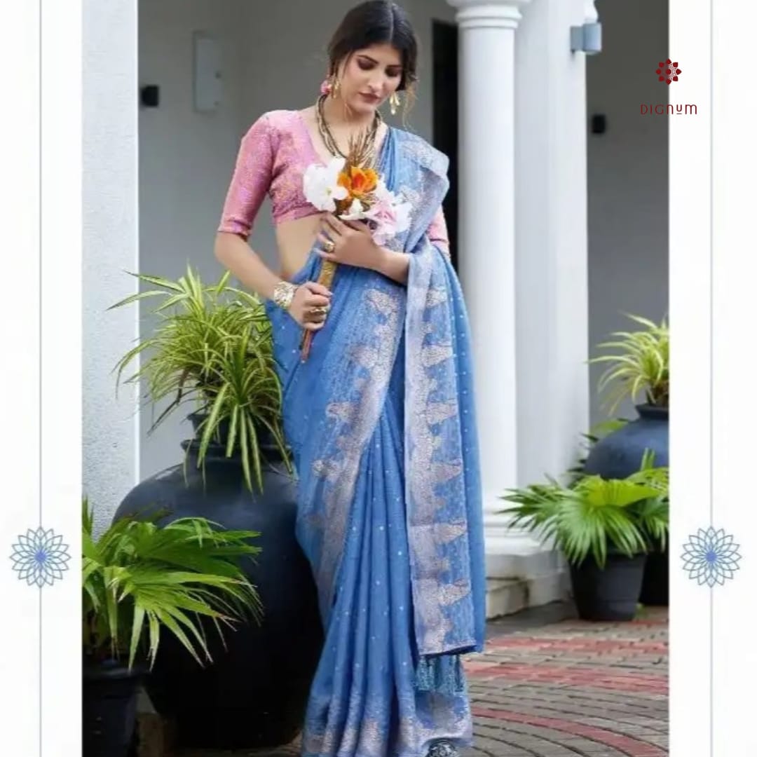 Saree Fabric: Experience elegance with our Alfino Chiffon Saree fabric, adorned with a delicate border and butti design. Paired with a jacquard blouse, it offers versatility and charm. Accentuated with spring tassels, this ensemble showcases vibrant, exclusive dyed colors that exude freshness and grace.