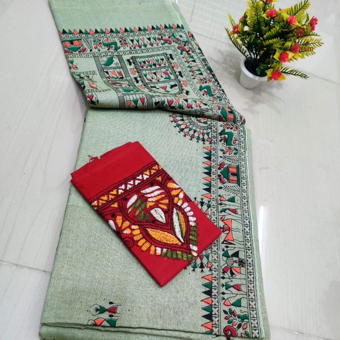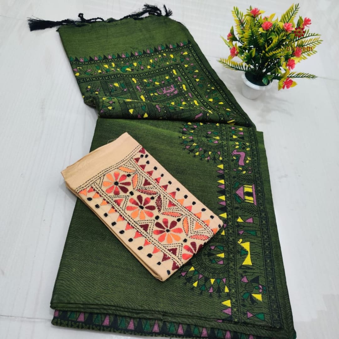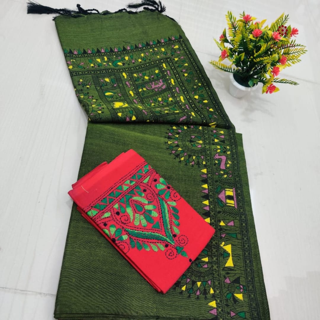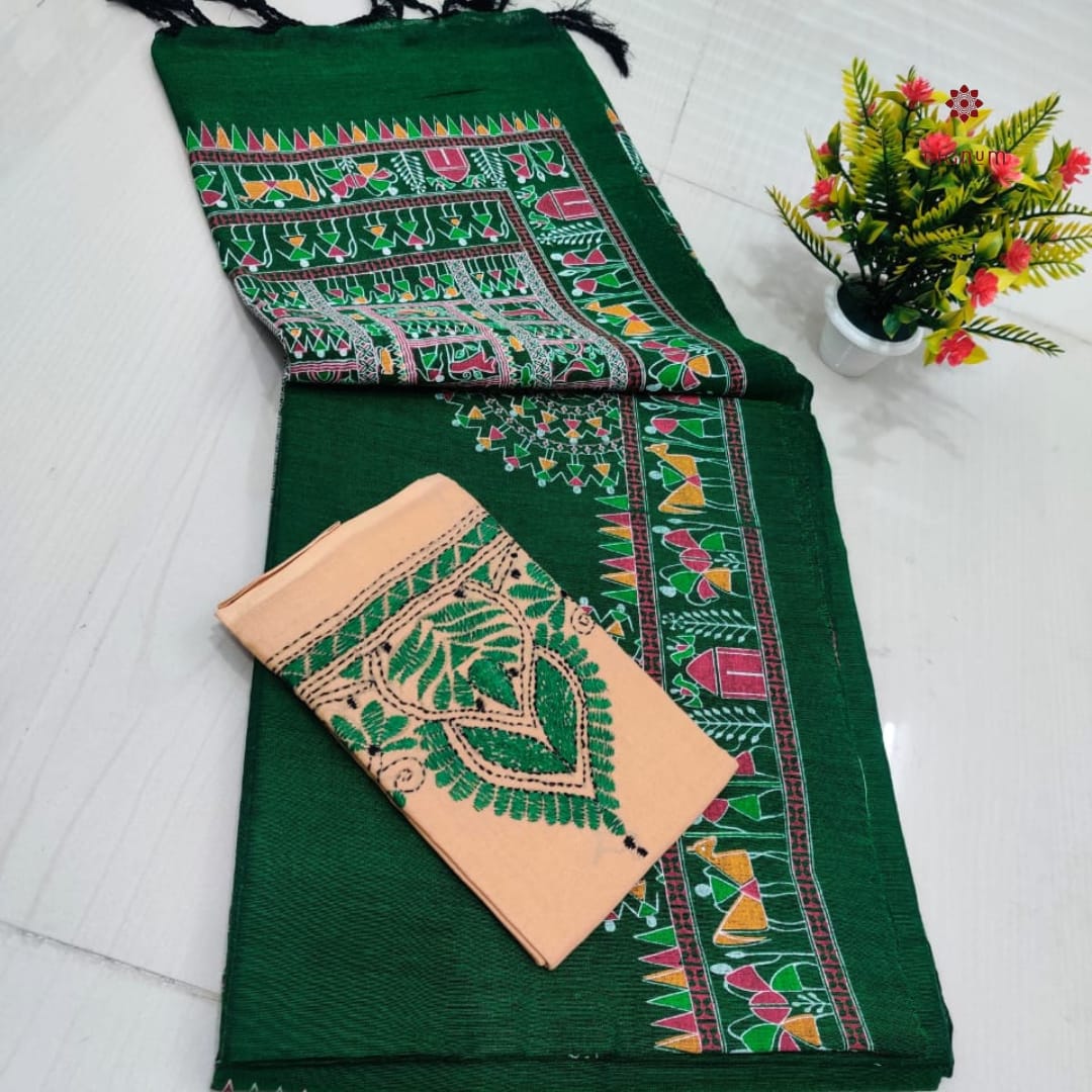 Saree Fabric: Best Quality Handspun Cotton Saree with a traditional Madhubani Print and Tassels in Pallu, perfect for effortless grace. Comes with a matching running blouse piece for a classic look. It includes an extra Kantha Stitch blouse piece for a vibrant twist. This Soft, breathable cotton-by-cotton fabric Saree ensures all-day comfort.