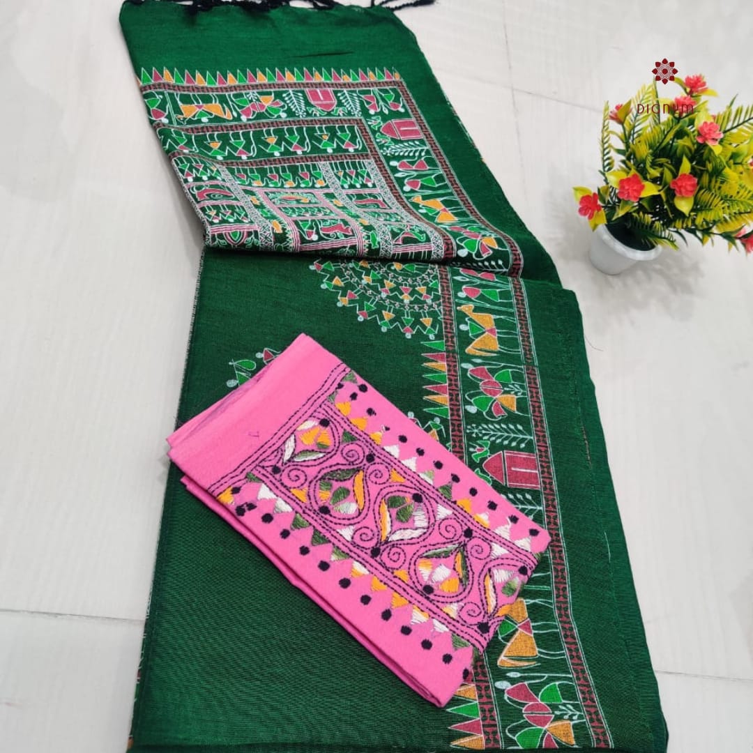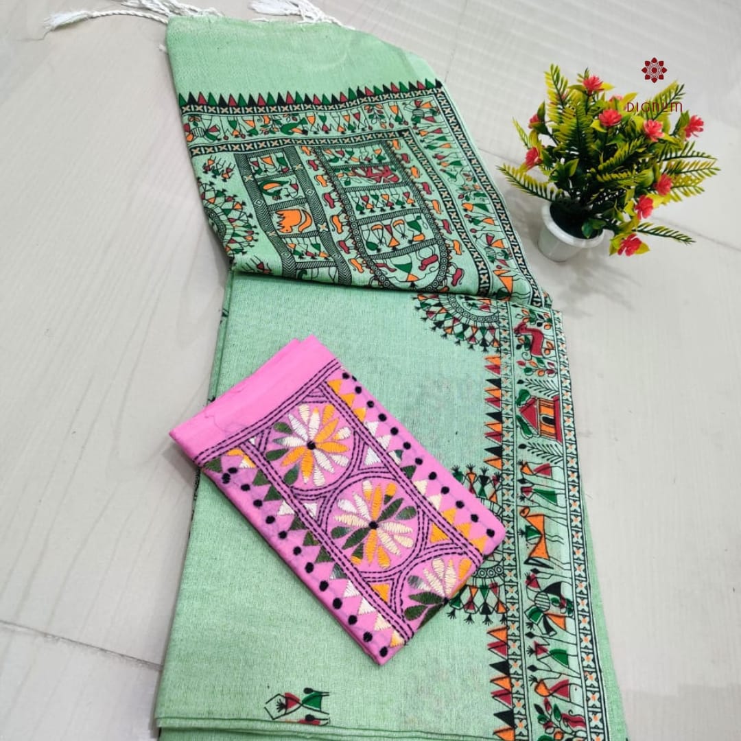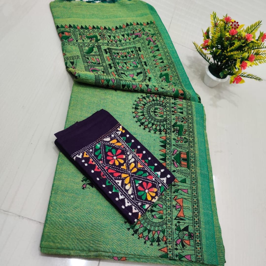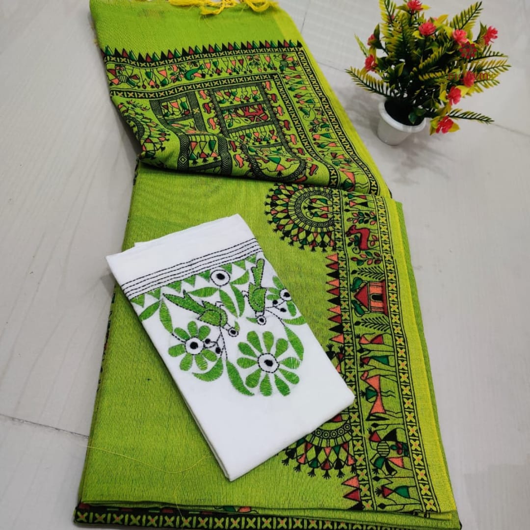 Saree Fabric: Best Quality Handspun Cotton Saree with a traditional Madhubani Print and Tassels in Pallu, perfect for effortless grace. Comes with a matching running blouse piece for a classic look. It includes an extra Kantha Stitch blouse piece for a vibrant twist. This Soft, breathable cotton-by-cotton fabric Saree ensures all-day comfort.