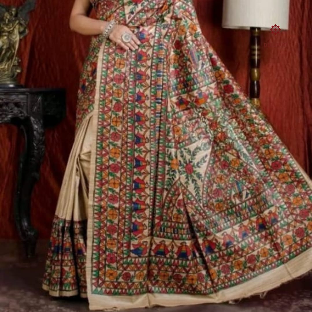 Ivory White Tussar Madhubani Hand Painted Saree