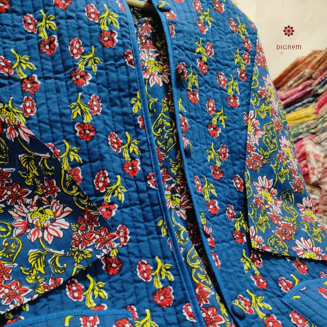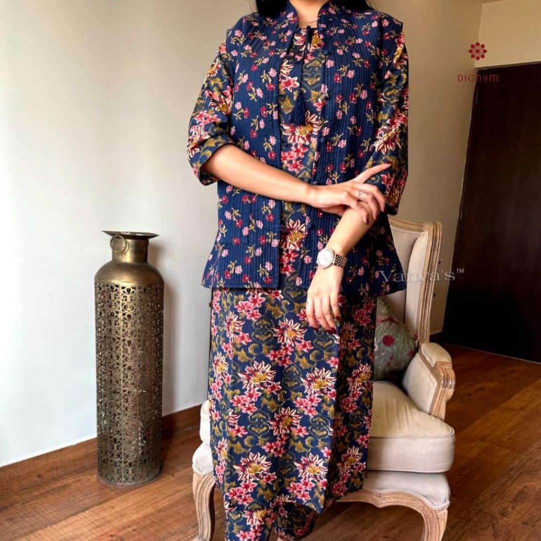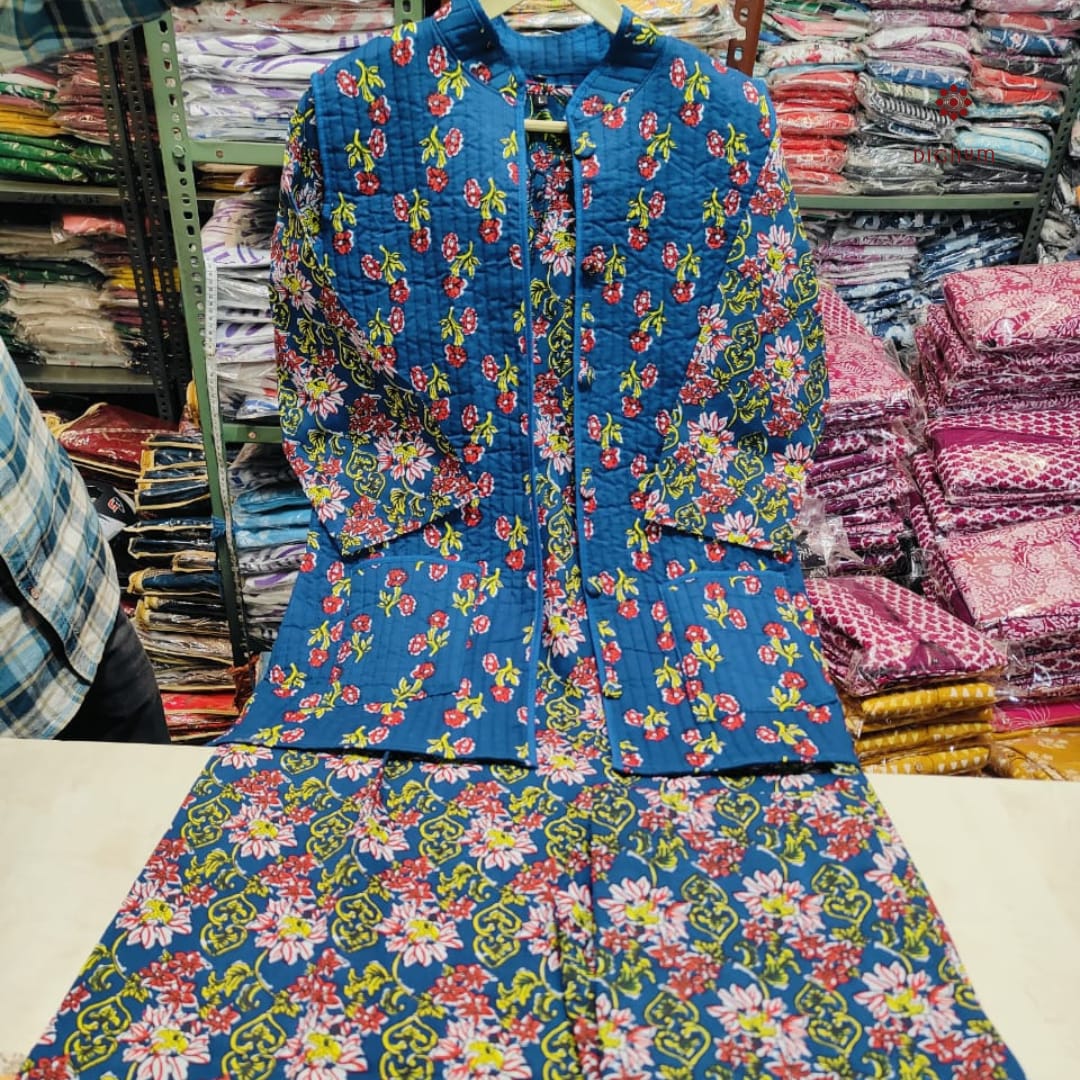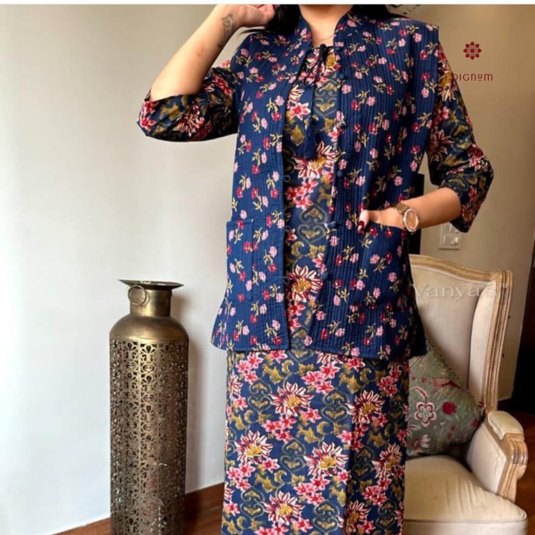 Stay cozy and stylish this winter with our exclusive Cotton Kurti Pant Set, thoughtfully paired with a soft quilted cotton jacket for added warmth and elegance. Crafted from pure hand block printed cotton, the kurti features a flattering silhouette, offering both comfort and grace.