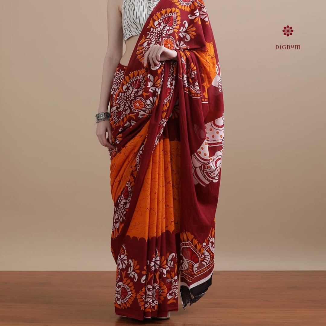 Orange Maroon Pure Mulmul Cotton Printed Saree