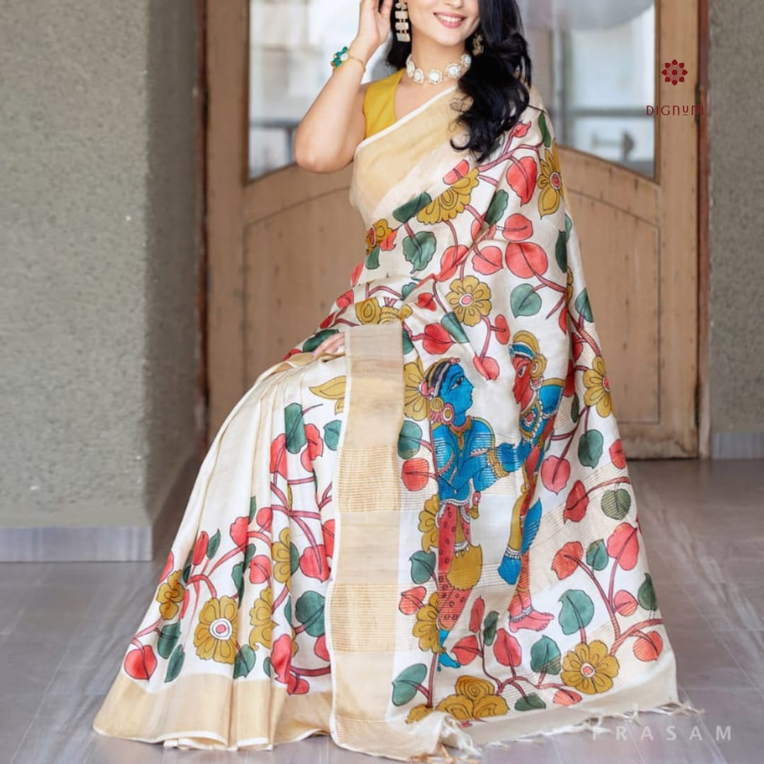 Saree Fabric: Elevate your ethnic wardrobe with this exquisite hand-painted Kalamkari saree, crafted on luxurious Pure Tussar fabric. Each intricate motif is a testament to traditional artistry and cultural heritage. Soft, breathable, and naturally textured, it comes with a matching blouse piece to complete the look. A timeless piece perfect for festive occasions or elegant gatherings.