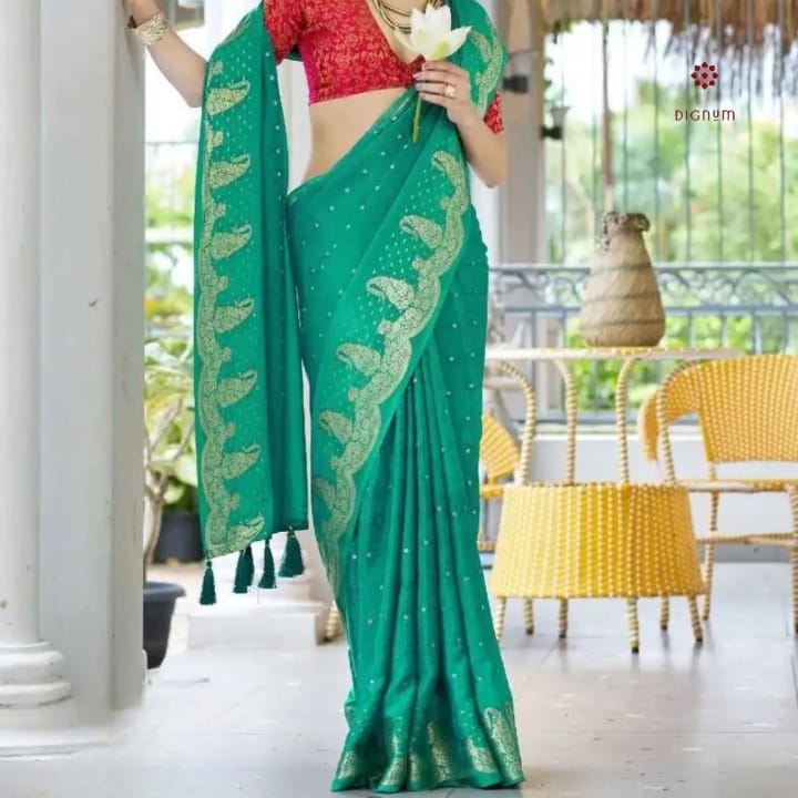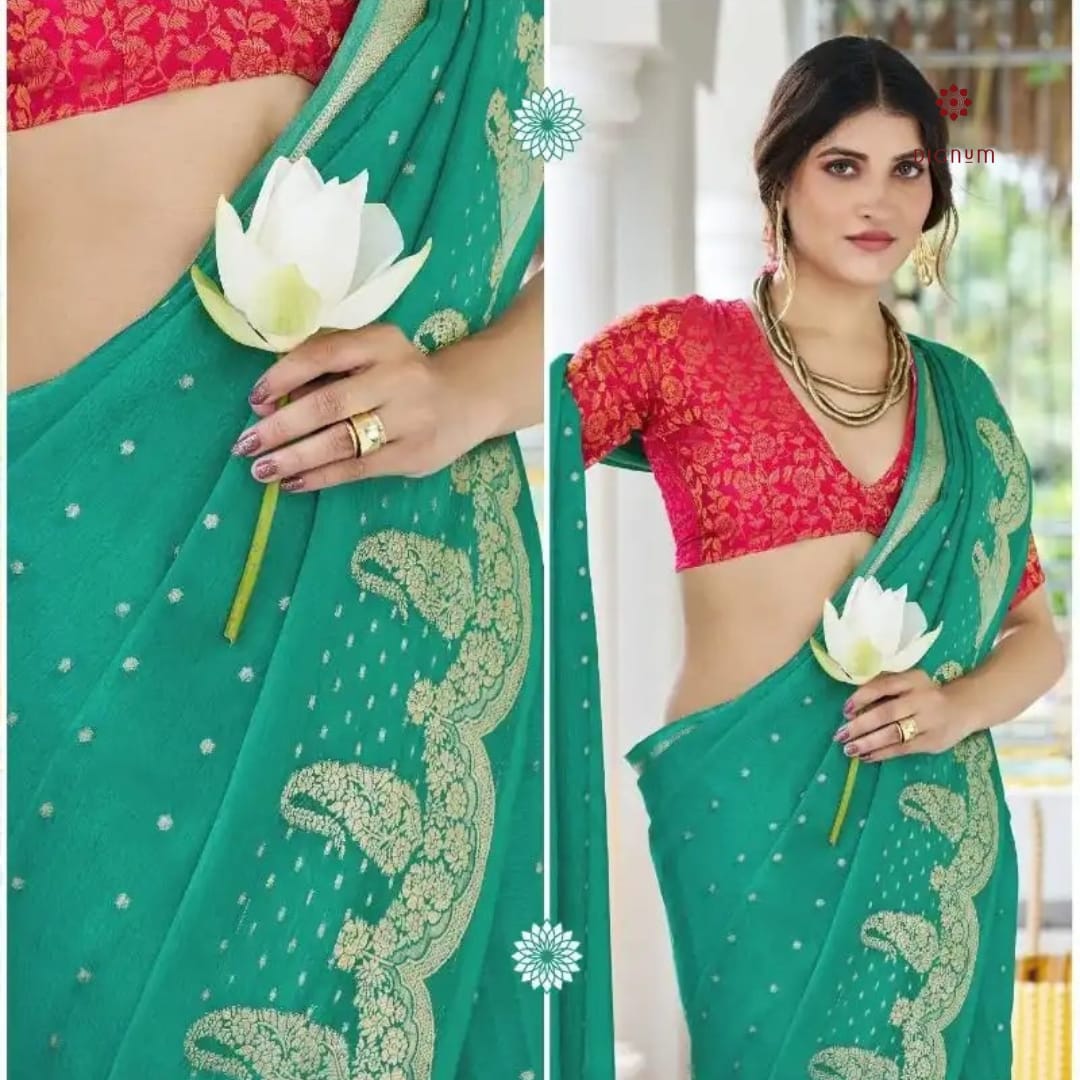 Saree Fabric: Experience elegance with our Alfino Chiffon Saree fabric, adorned with a delicate border and butti design. Paired with a jacquard blouse, it offers versatility and charm. Accentuated with spring tassels, this ensemble showcases vibrant, exclusive dyed colors that exude freshness and grace.