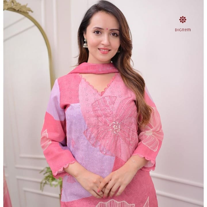 Kurti Fabric: Heavy Schiffli Linen Cotton Kurta with Digital Print and Hand Khatli work Embroidery. There is Lace Work on Neck and Sleeves.