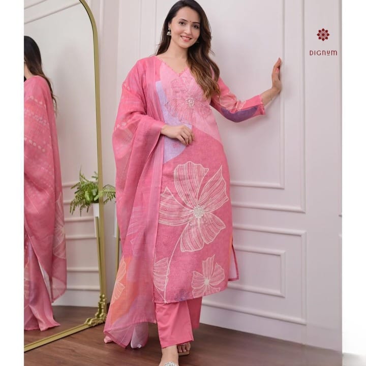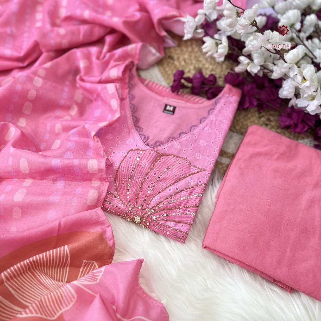 Pink Heavy Schiffli Linen Embroidered Suit Set