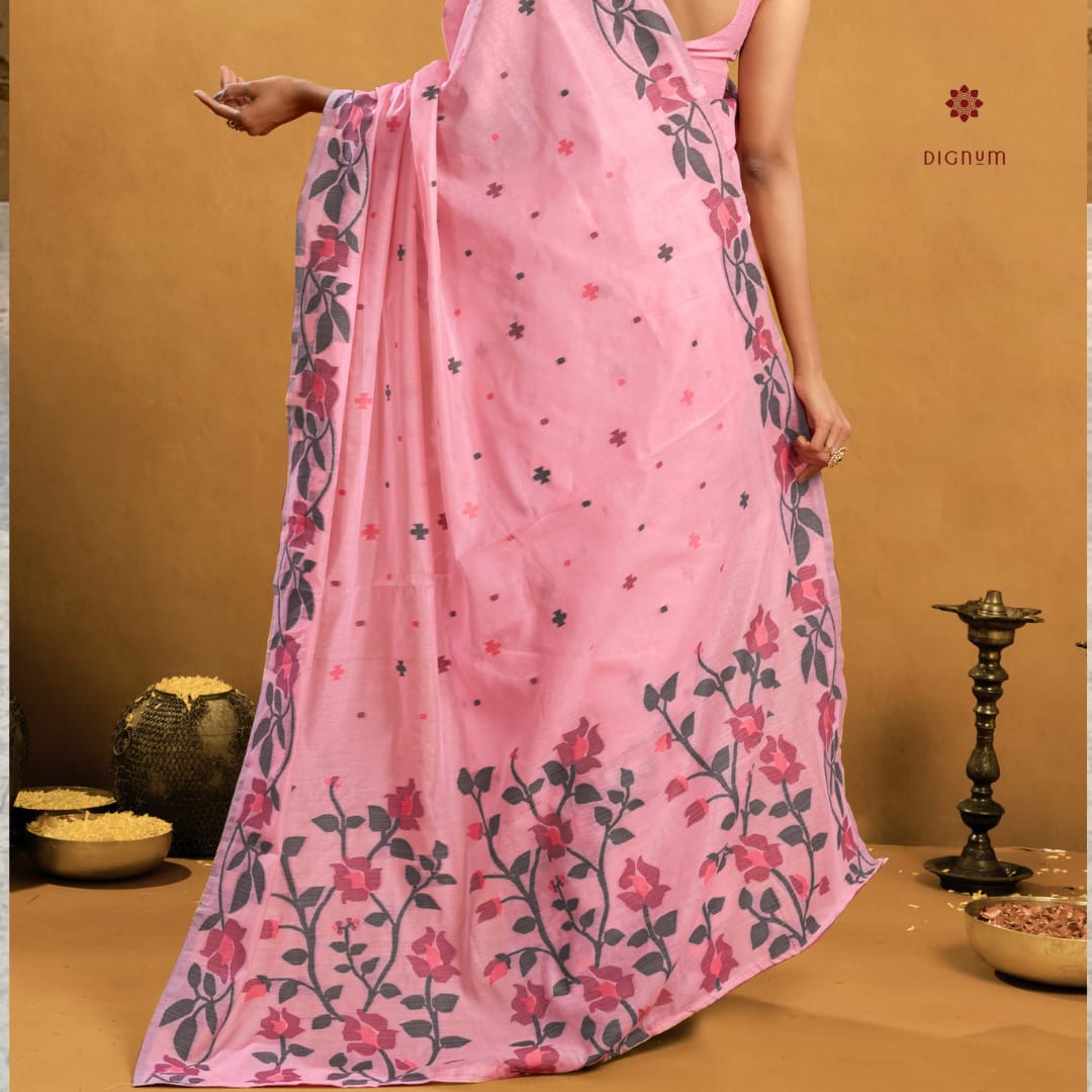 Saree Fabric: Muga Cotton Jamdani Saree with intricate floral weave border and pallu. Crafted from premium Muga cotton, it exudes a rich texture and subtle sheen. The saree comes with a 6.30-meter length including blouse fabric, ensuring a complete ensemble. The running blouse features all-over Jamdani floral weave butties and a matching border, adding a graceful continuity to the look