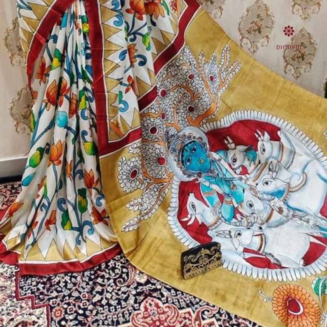 Pure White Hand Painted Kalamkari Pure Silk Saree