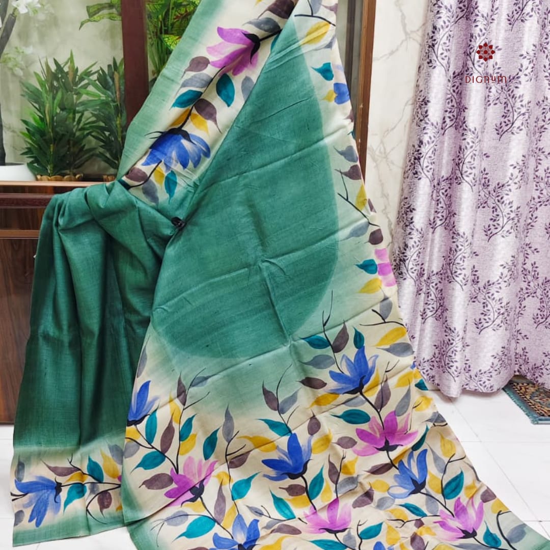 Rama Green Pure Gachi Tussar Silk Hand Painted Saree