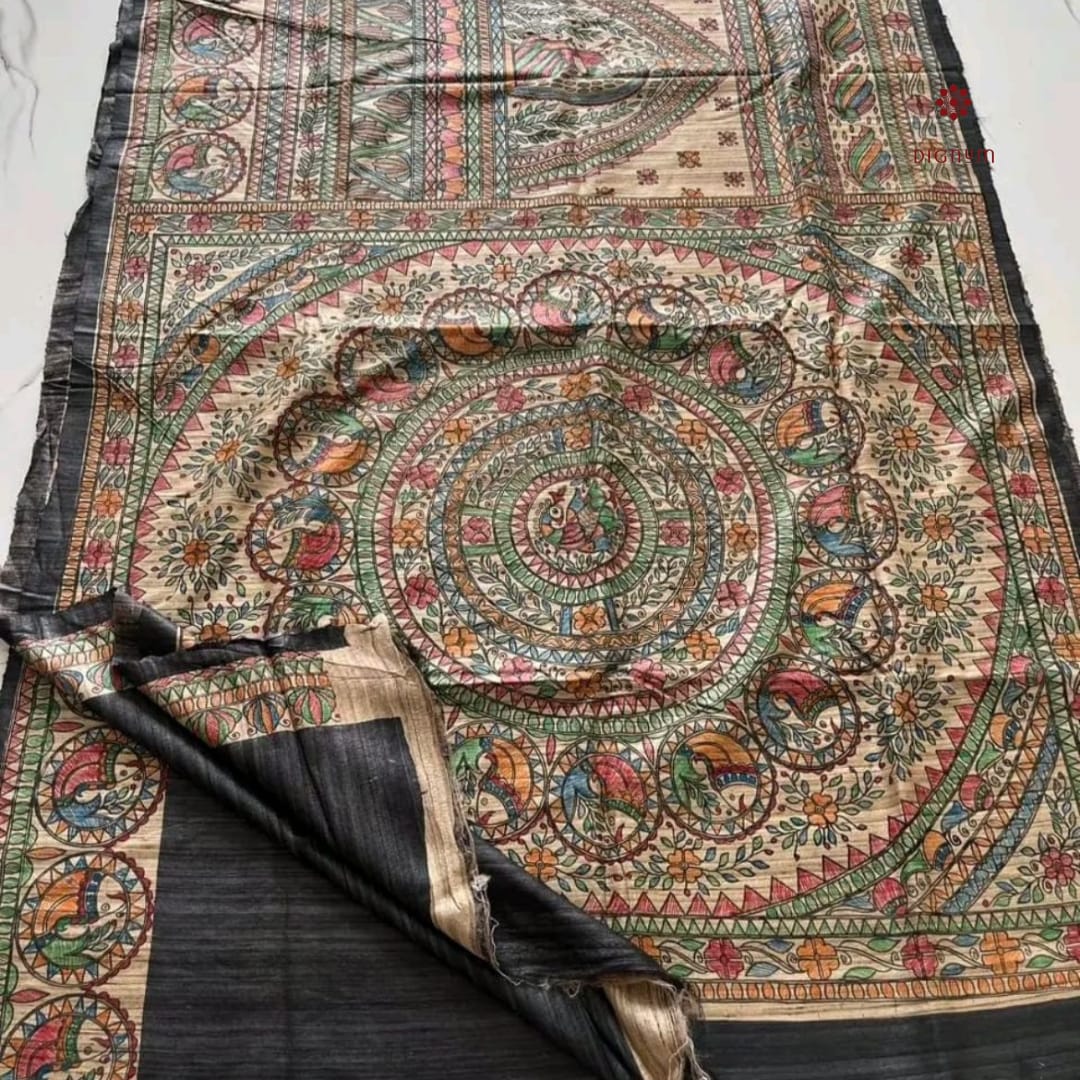 Be the first to review “Raven Black Tussar Madhubani Hand Painted Saree”