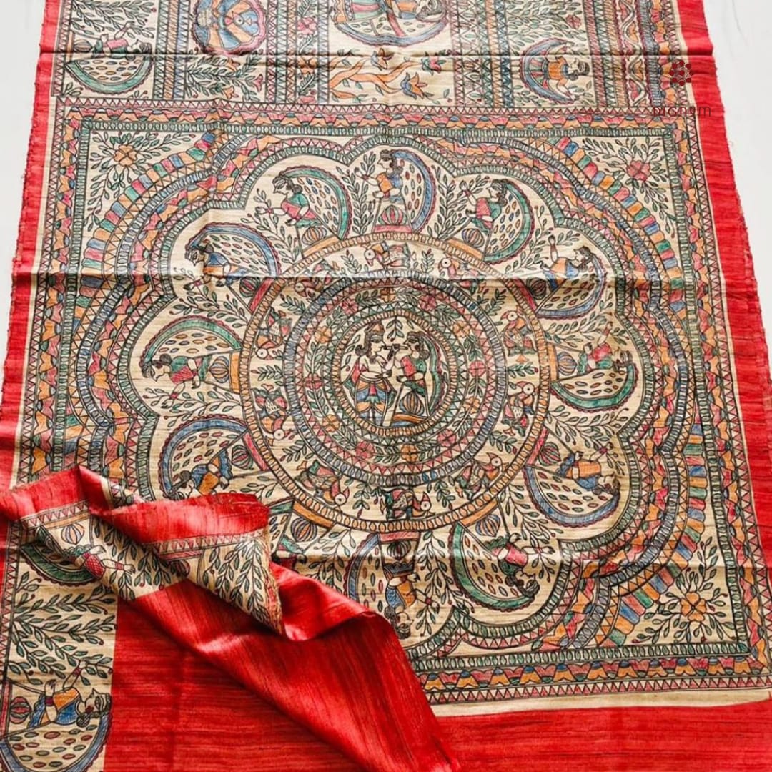 Scarlet Red Tussar Madhubani Hand Painted Saree