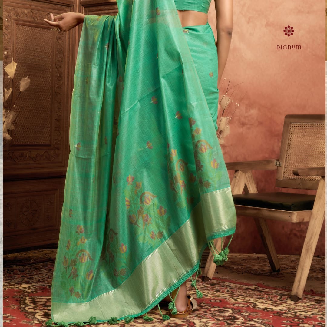 Saree Fabric: Exquisite Muga Cotton Saree, featuring a handloom-style floral weaving that exudes traditional charm. Adorned with allover floral weaving butties and a beautifully designed floral weave pallu with Tassels. The saree measures 6.30 meters with blouse, ensuring a perfect fit.