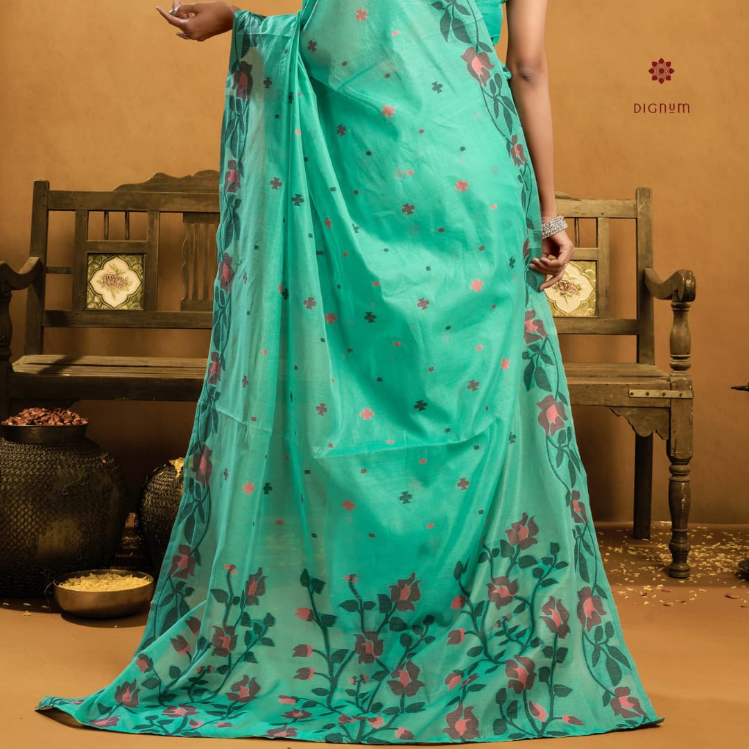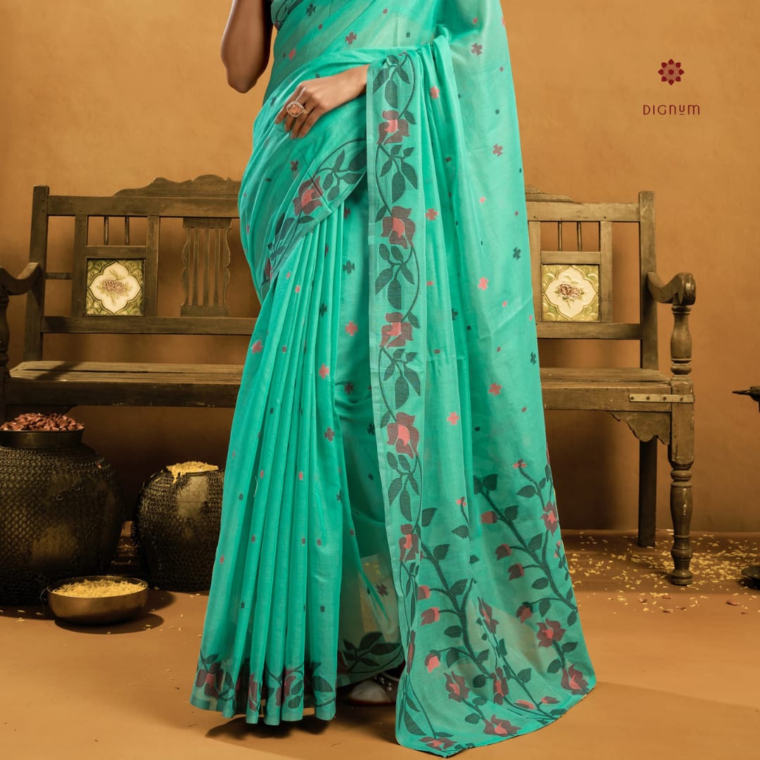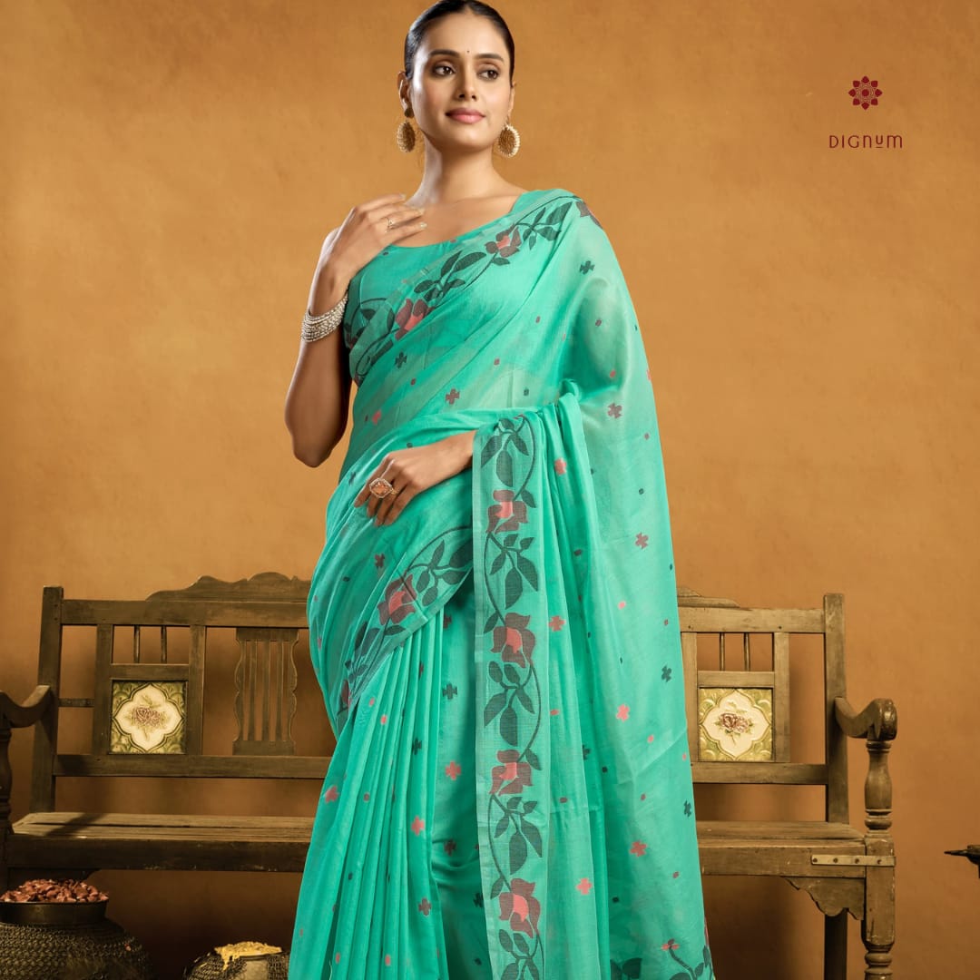 Saree Fabric: Muga Cotton Jamdani Saree with intricate floral weave border and pallu. Crafted from premium Muga cotton, it exudes a rich texture and subtle sheen. The saree comes with a 6.30-meter length including blouse fabric, ensuring a complete ensemble. The running blouse features all-over Jamdani floral weave butties and a matching border, adding a graceful continuity to the look