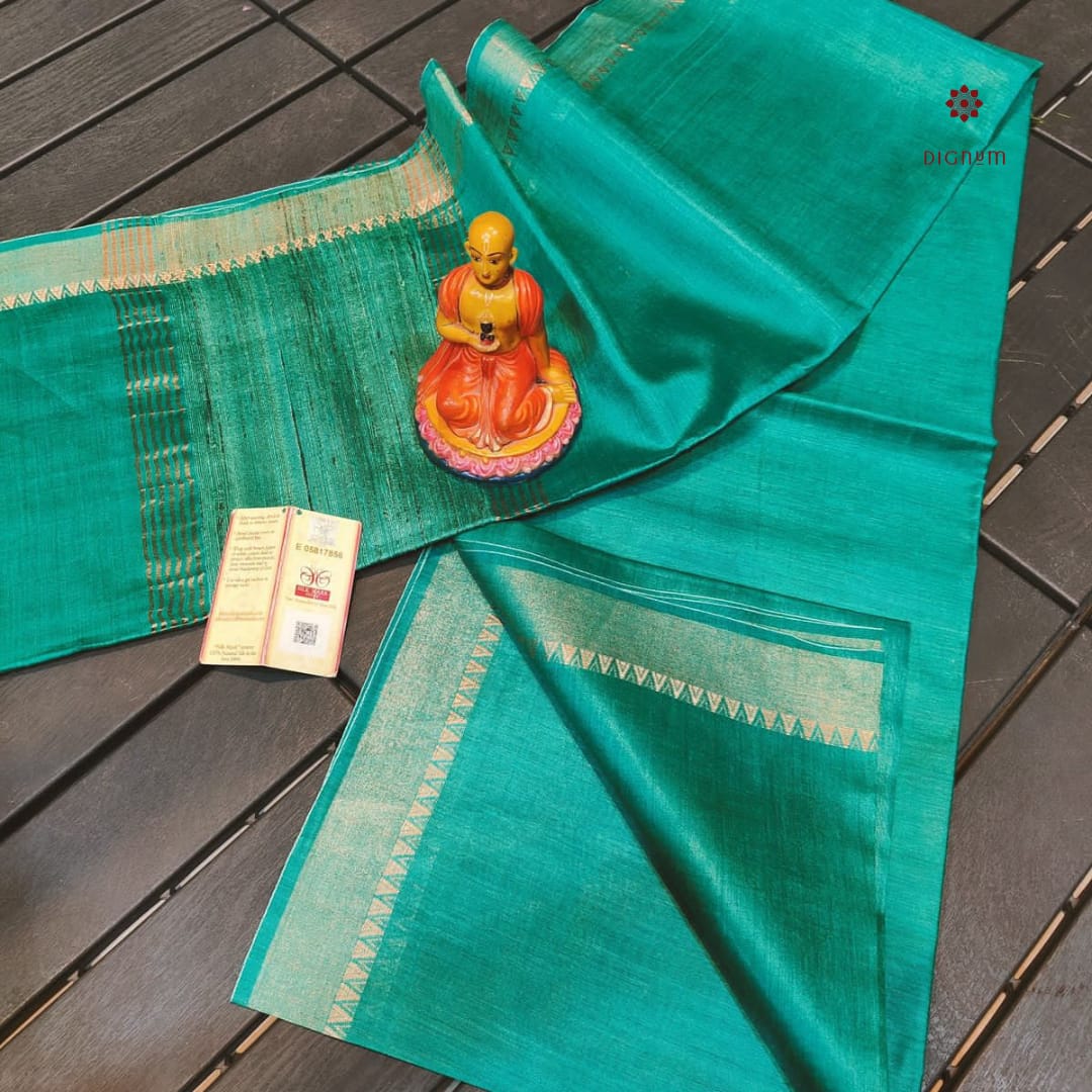 Saree Fabric: Pure Tusser Munga Silk Saree with a classic Banarasi woven border. This Saree features a small elegant border and rich ghicha zari pallu for a graceful look. Made from superb quality silk, it has a smooth texture and is very comfortable to wear. It comes with a Silk Mark certified tag for authenticity. The Saree is perfect for festive wear, parties, and special occasions.