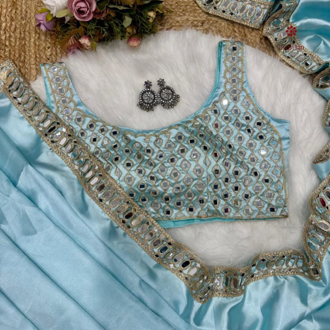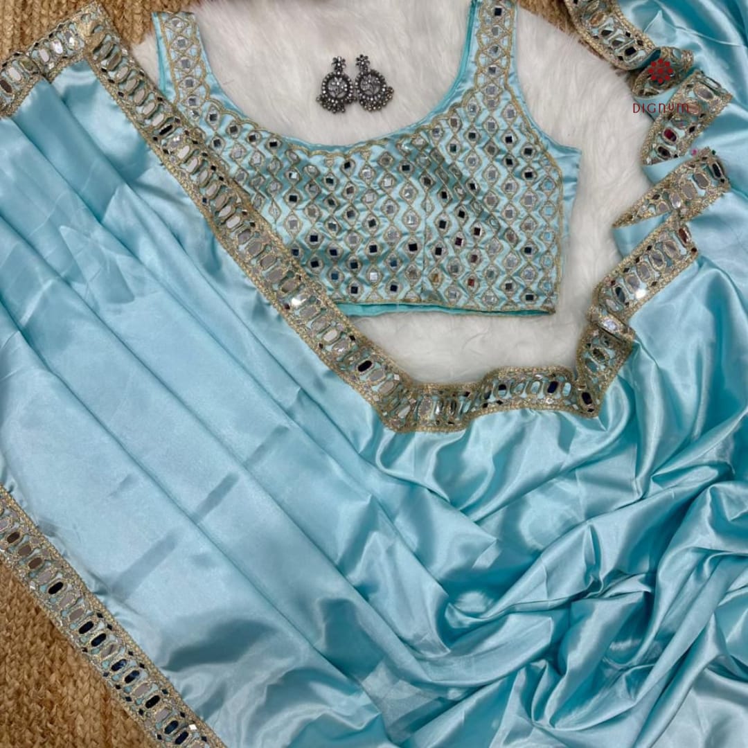 Sky Blue Satin Mirror Embellished Work Saree