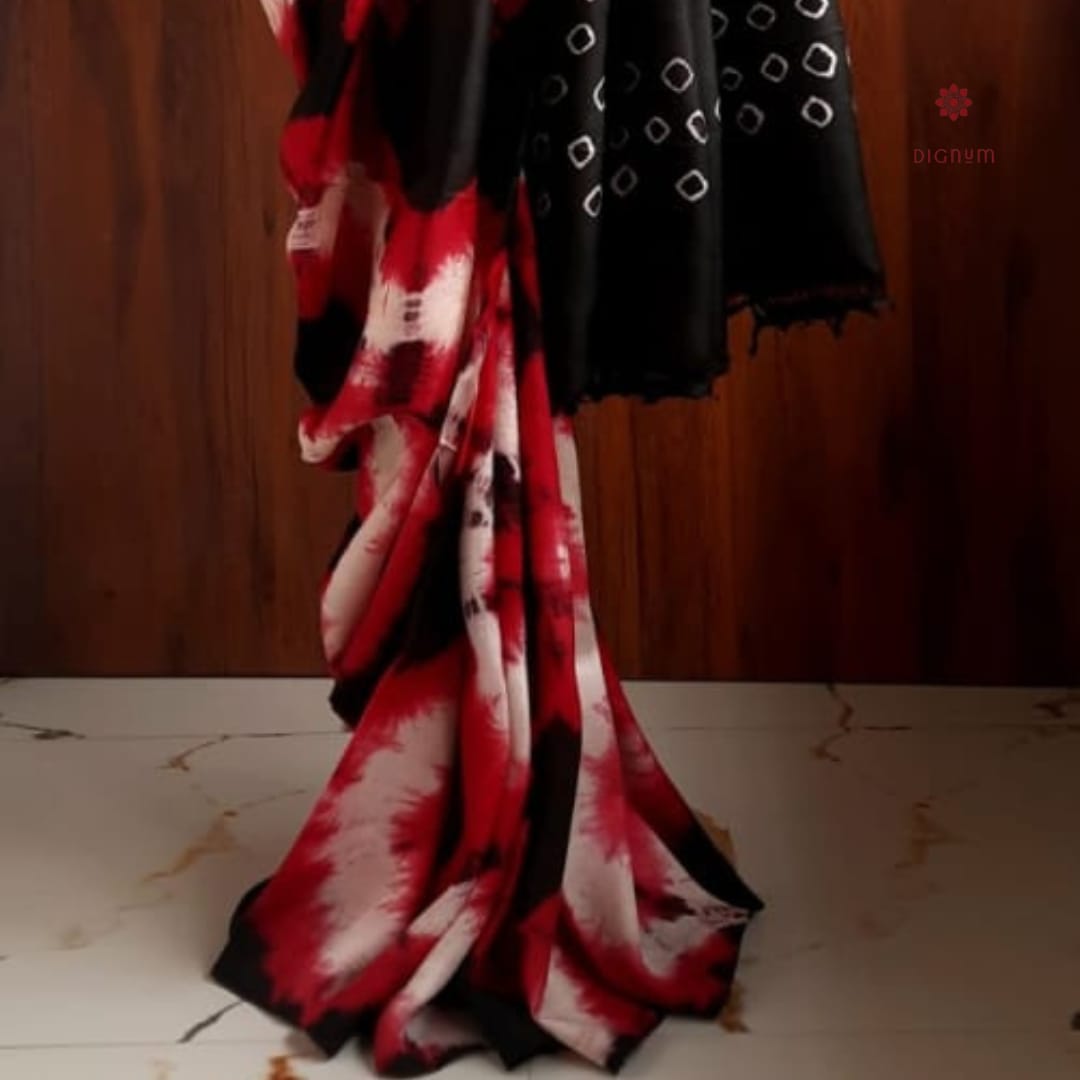 Saree Fabric: Exclusive Pure Bishnupuri Silk (3-ply) Saree adorned with intricate hand Bandhani Tie & Dye Work.  The Saree comes with Silk Mark certification for authenticity and quality. The soft, lightweight silk ensures all-day comfort with a touch of elegance. This saree comes with a matching blouse piece, offering a complete, ready-to-style look.
