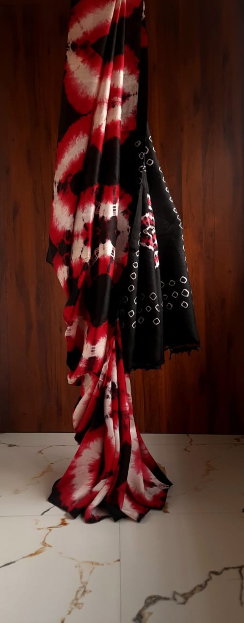 Tricolor Pure Silk Tie & Dye Hand Bandhani Saree