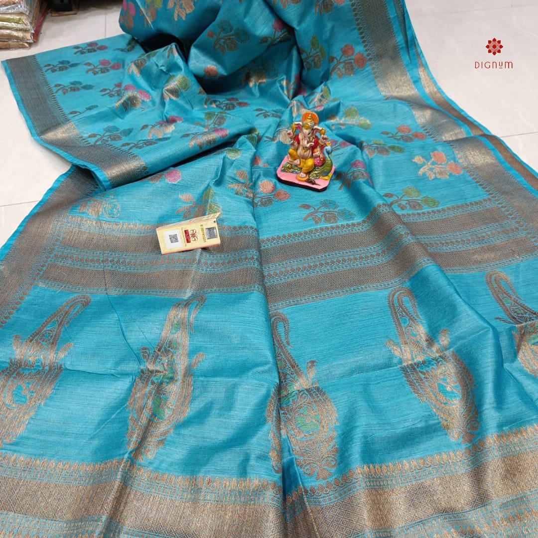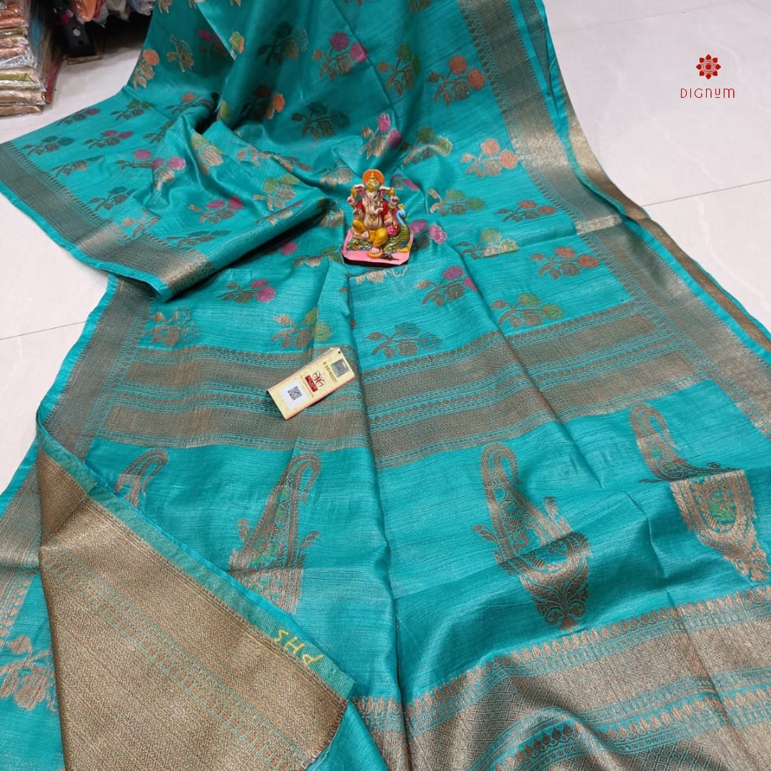 Saree Fabric: 100 Percent Pure Tusser by Munga Silk Banarasi Saree with Floral Design with Zari Border. It’s a Premium Quality Silk Saree with Silk Mark Tag.