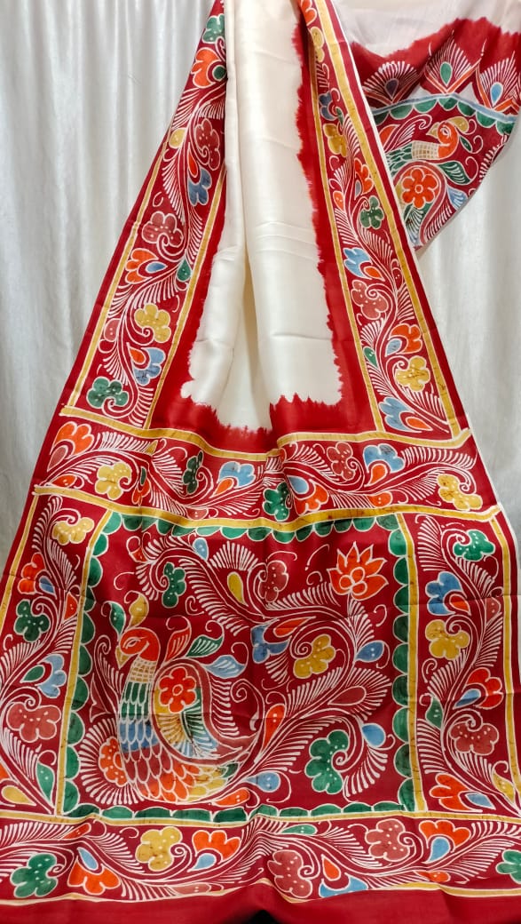 White & Red Hand Painted Batik Pure Silk Saree