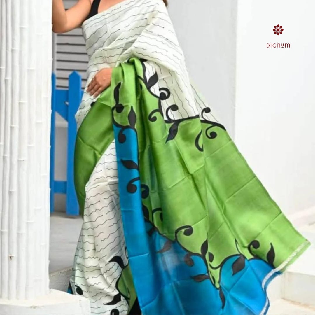 White Stylish Hand Painted Pure Silk Saree
