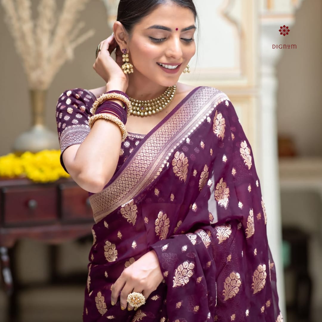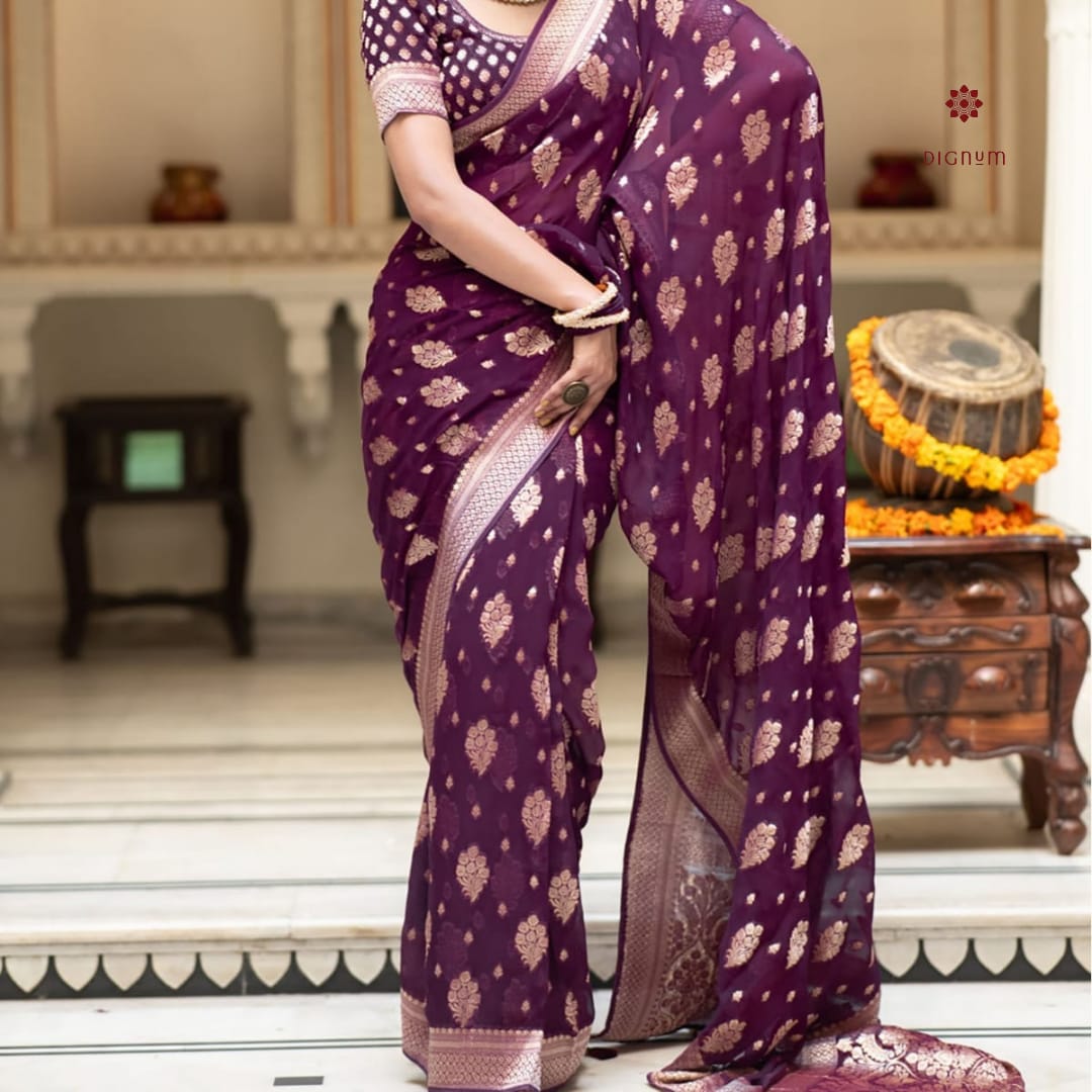 Be the first to review “Wine Purple Woven Banarasi Georgette Saree”