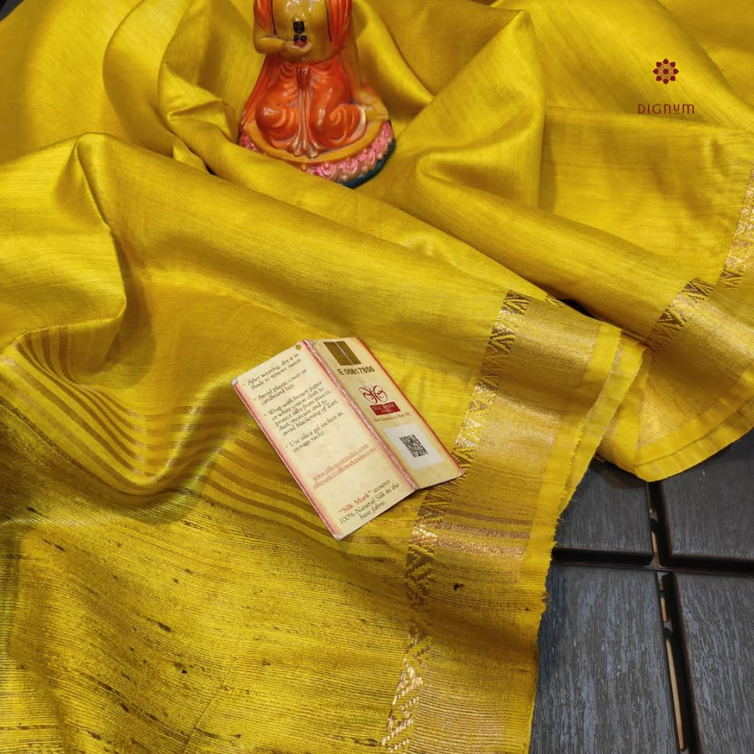 Saree Fabric: Pure Tusser Munga Silk Saree with a classic Banarasi woven border. This Saree features a small elegant border and rich ghicha zari pallu for a graceful look. Made from superb quality silk, it has a smooth texture and is very comfortable to wear. It comes with a Silk Mark certified tag for authenticity. The Saree is perfect for festive wear, parties, and special occasions.