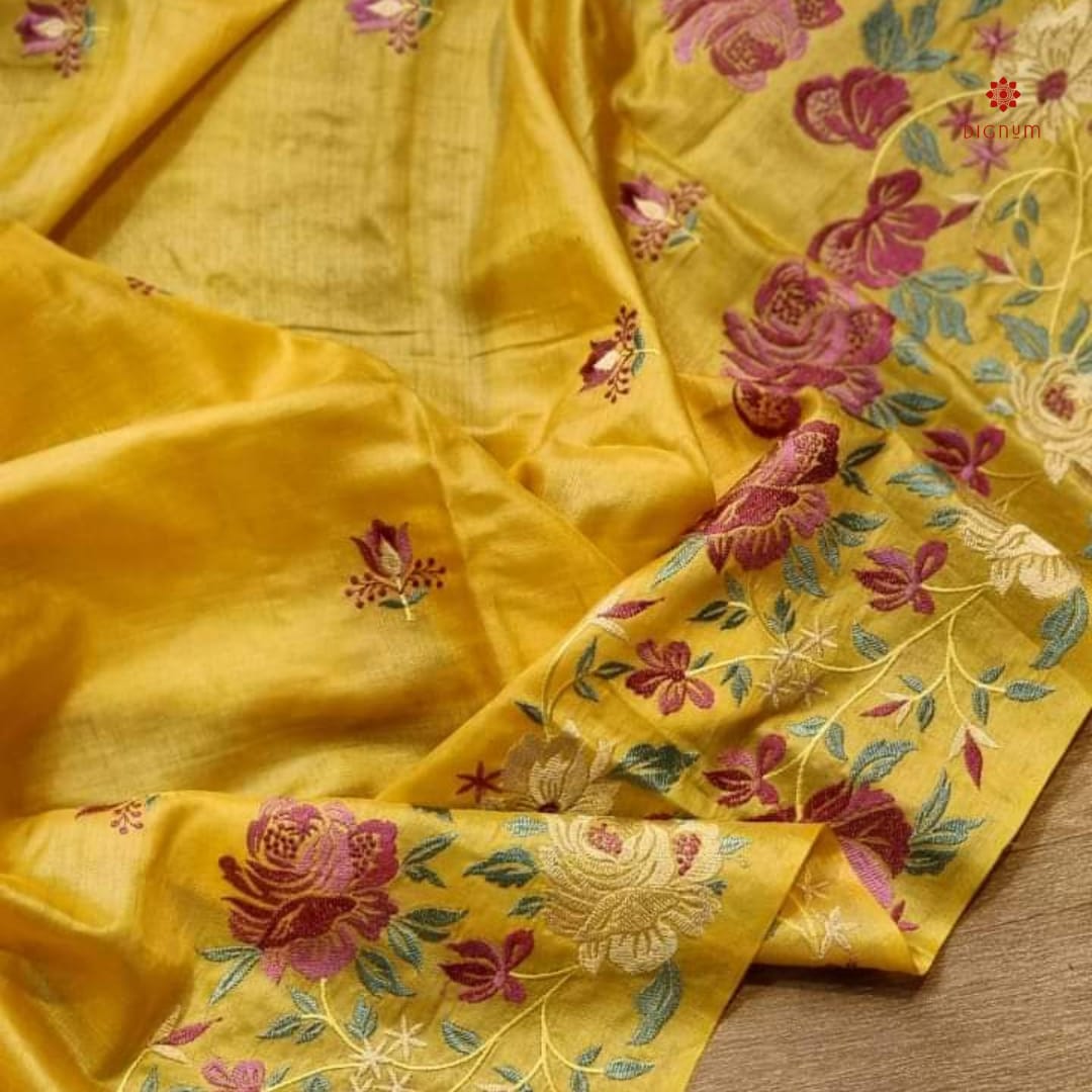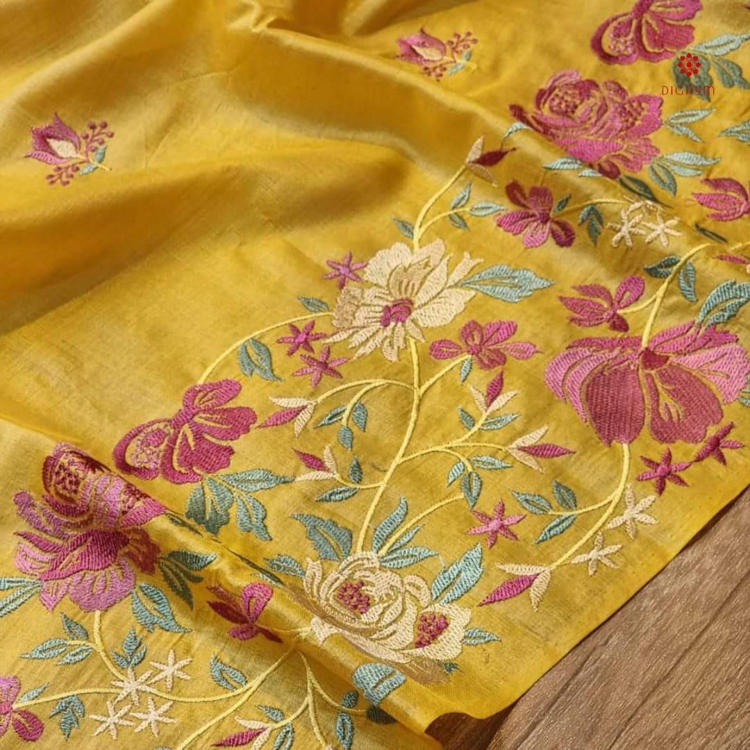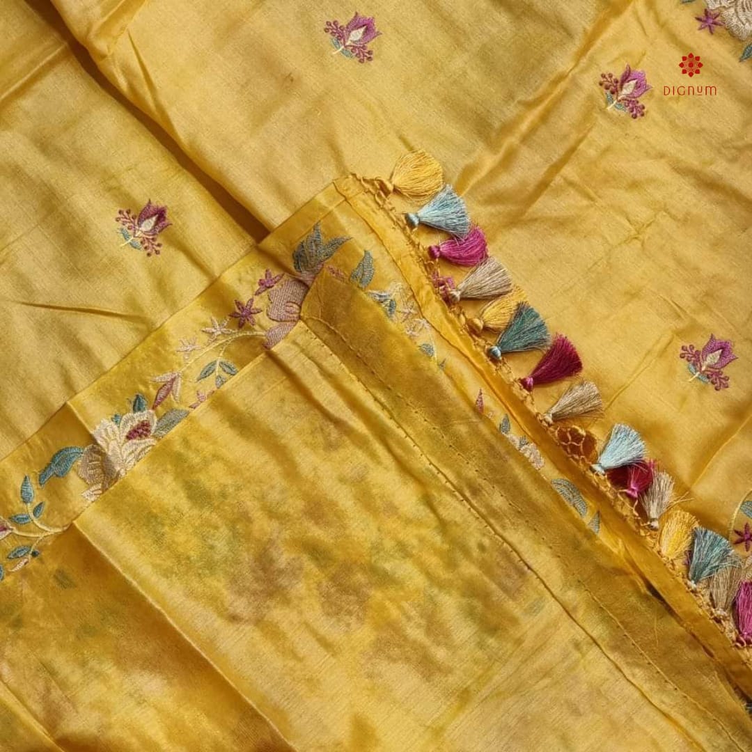 Saree Fabric: Pure Tusser by Tusser Silk Saree with Beautiful Embroidery Work. It’s a Premium Quality Silk Mark Certified Saree.